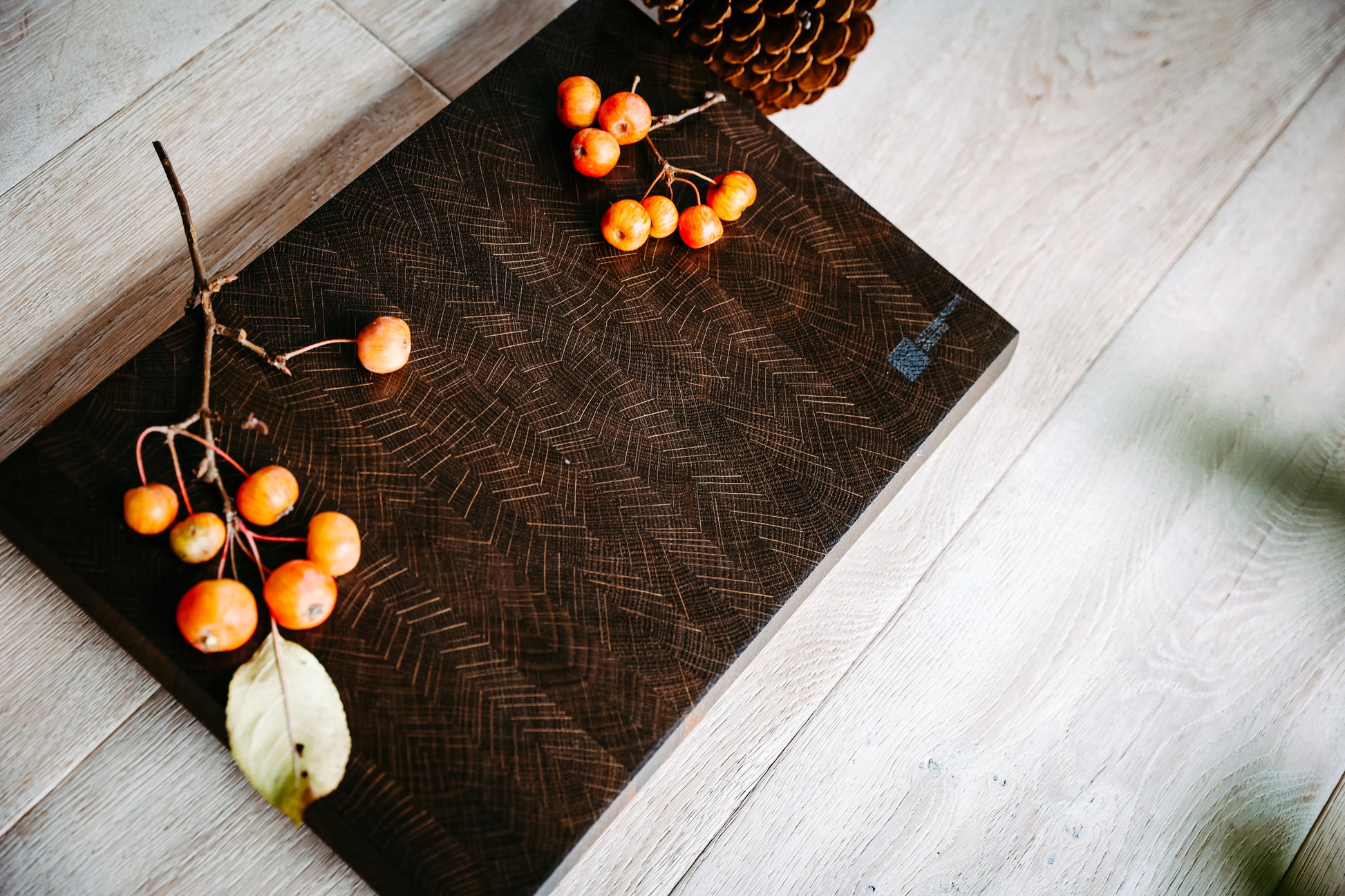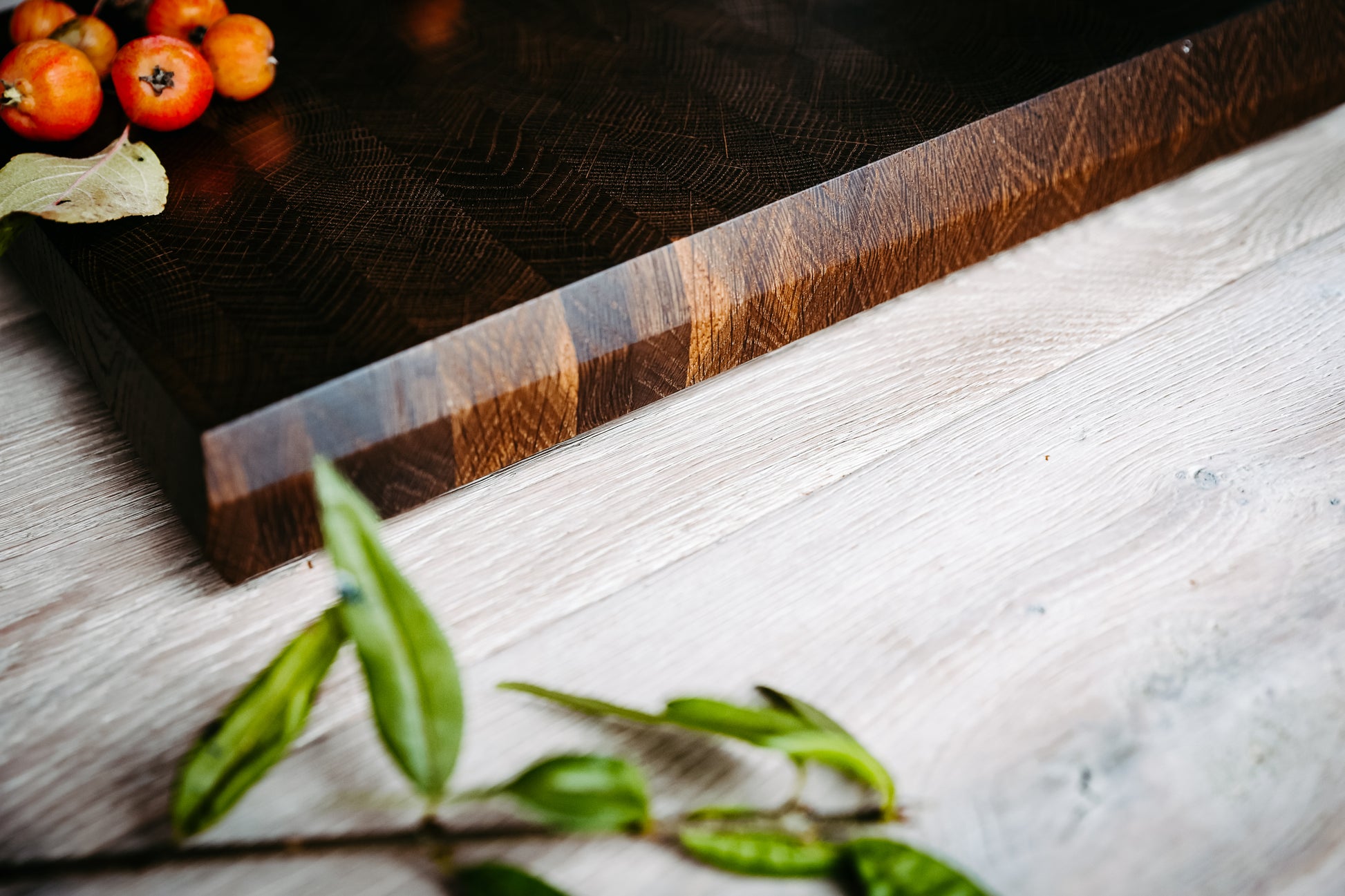 Dieses Schneidebrett aus massiver Räuchereiche überzeugt durch ehrliche Handarbeit und lebendige Holzmaserung. Die Kante zeigt sich besonders durch ihren asymmetrische Verlauf.
