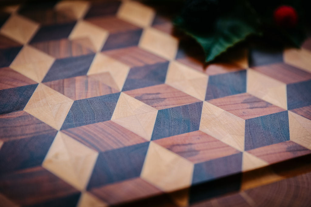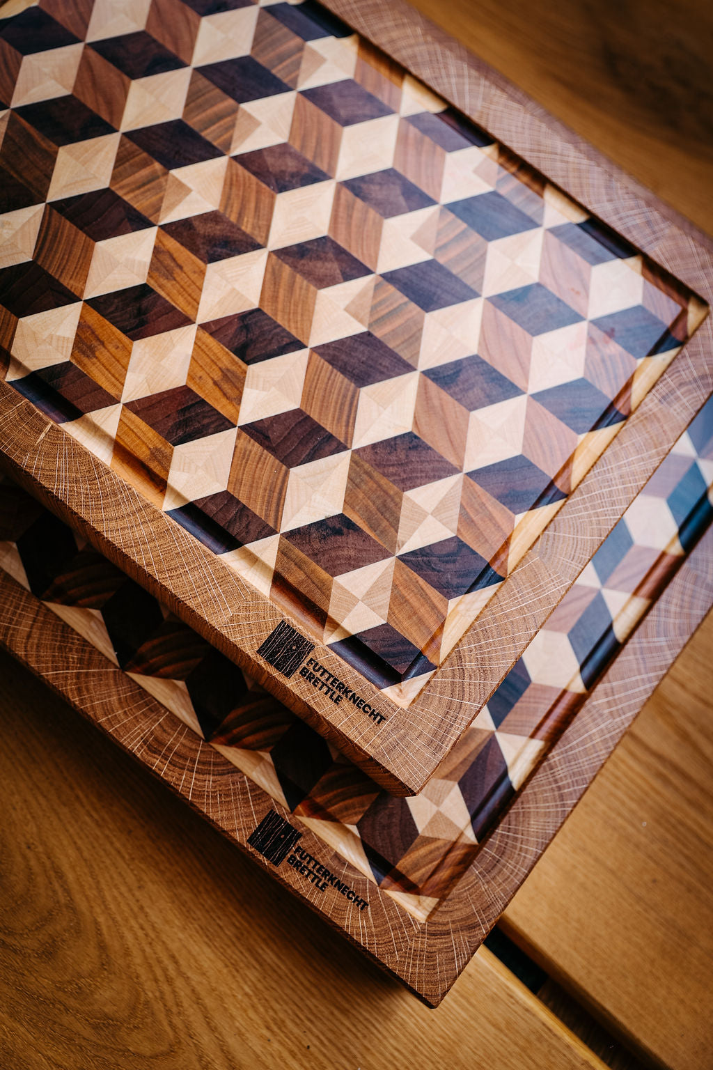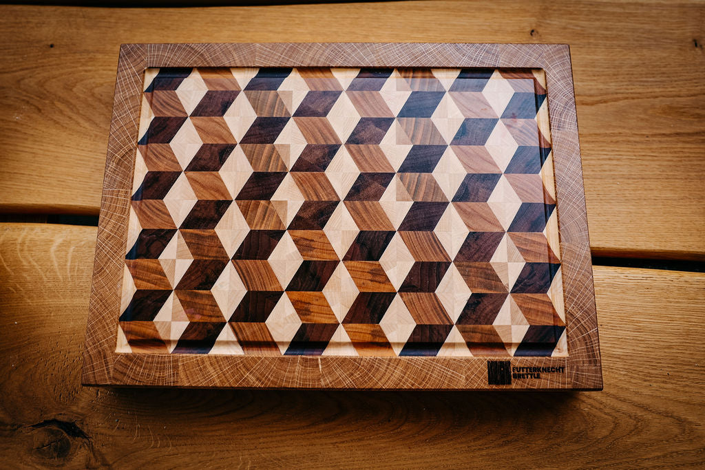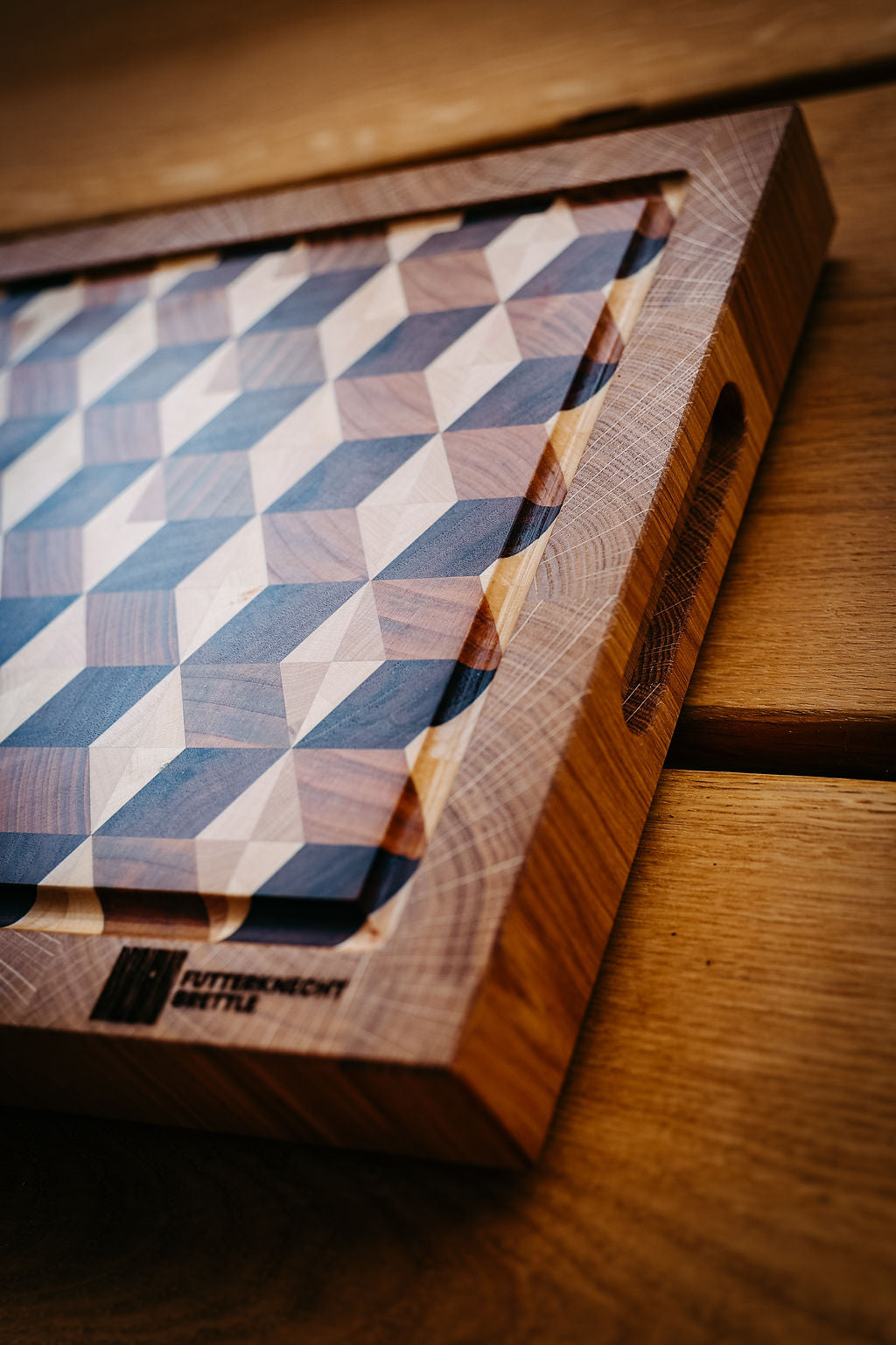 Design: Dreidimensional wirkendes handgefertigtes Würfelmuster in hellen und dunklen Holztönen